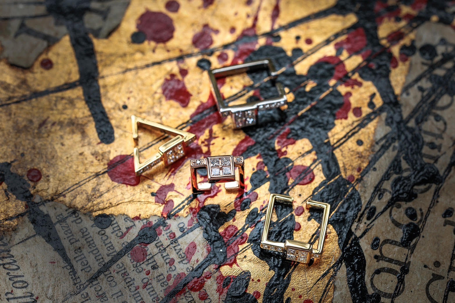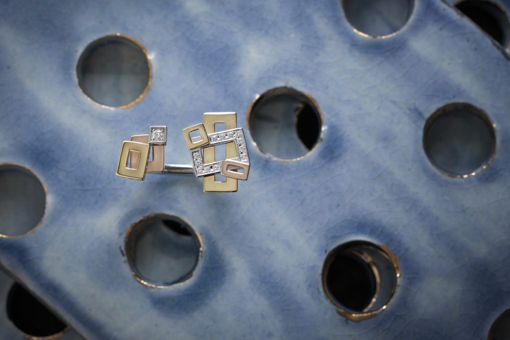 イエローゴールド、ホワイトゴールド、ピンクゴールドの様々な形の四角を重ねた積み木