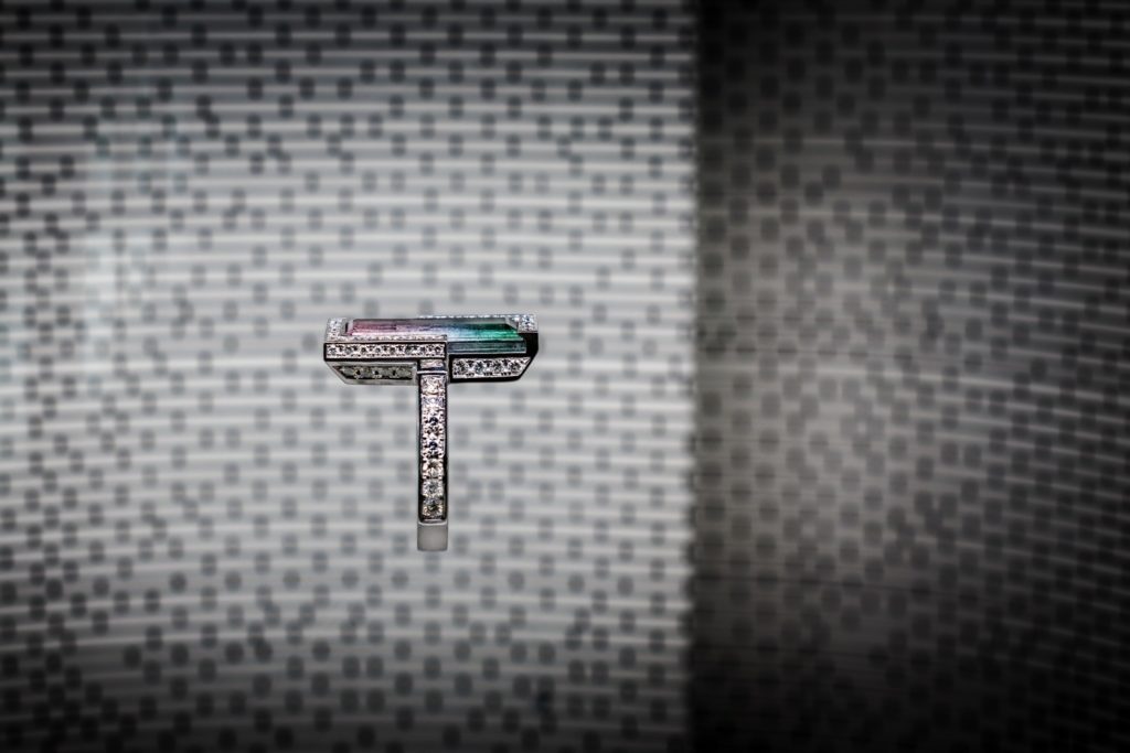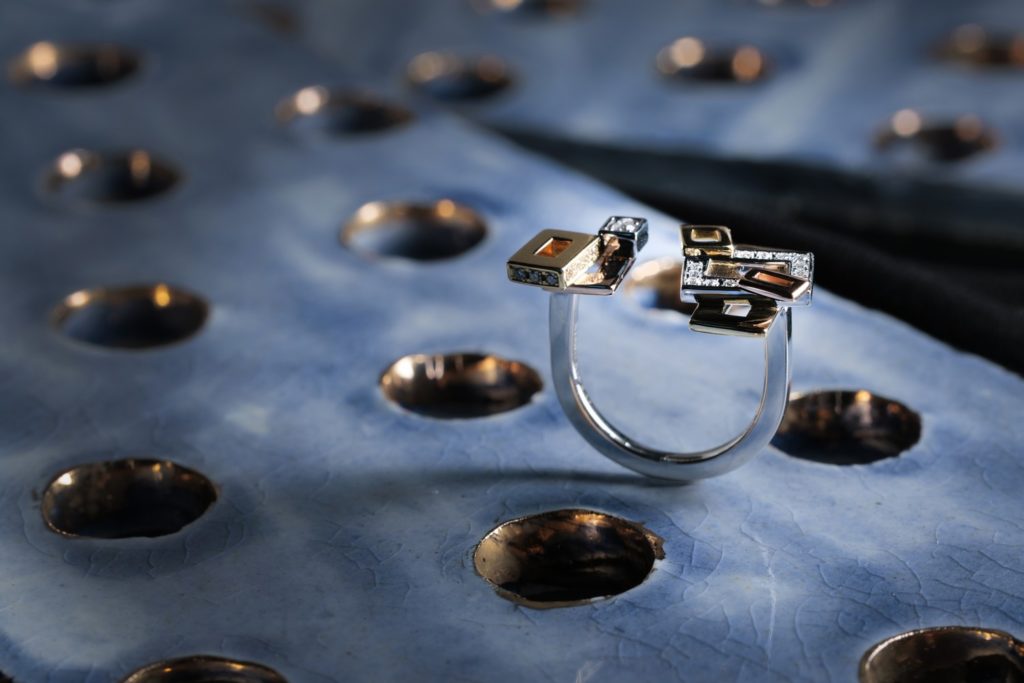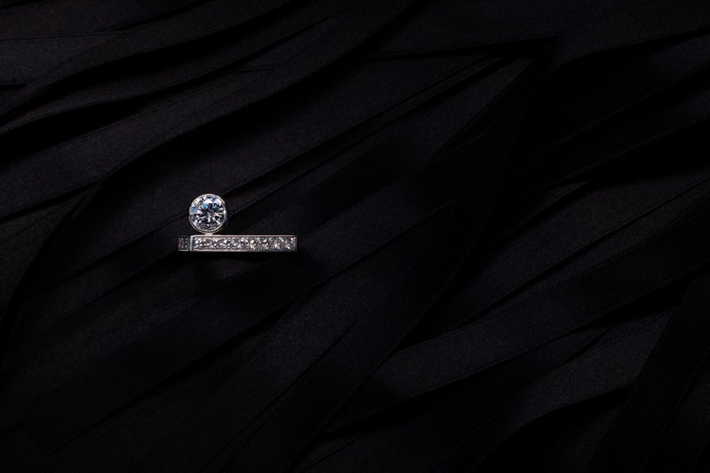 ホワイトゴールドを使用し直線的なデザインで